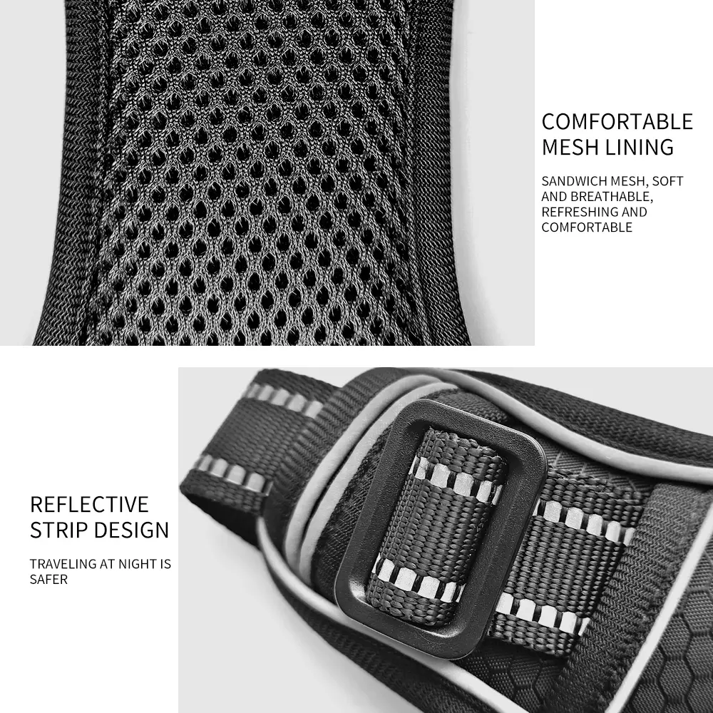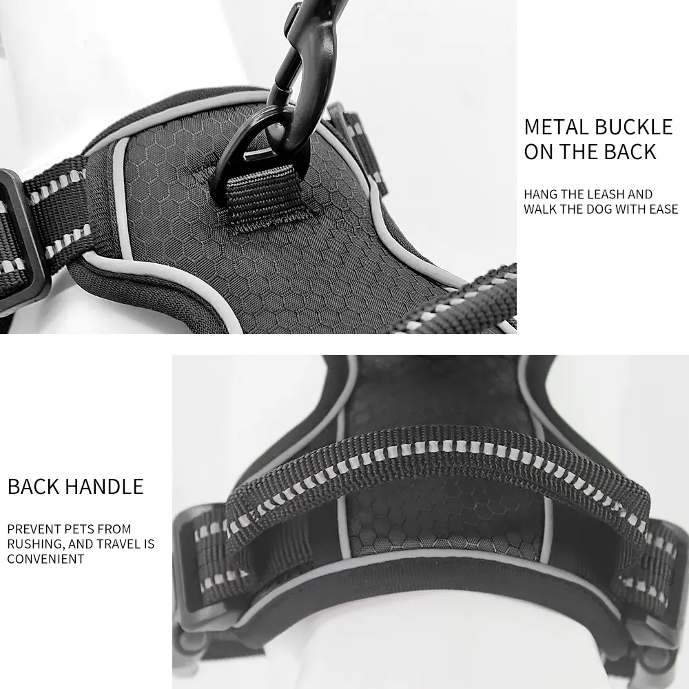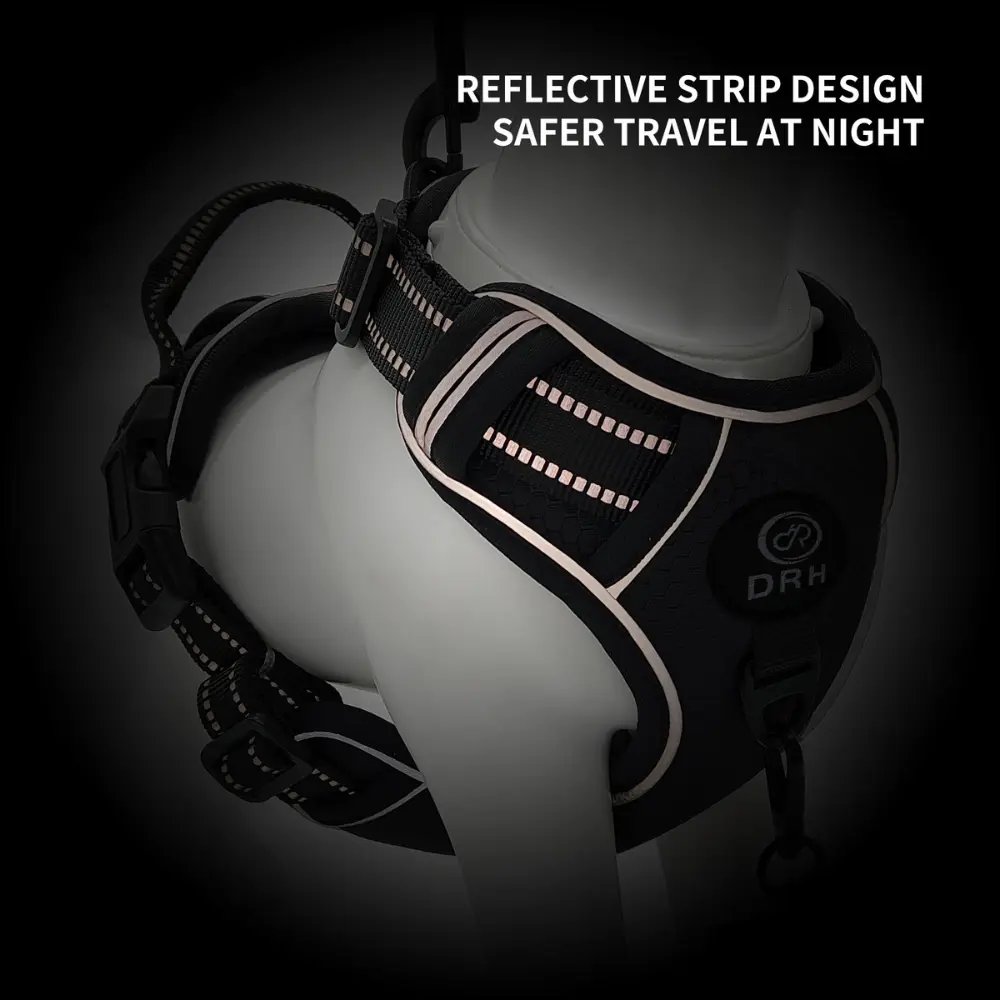 Reflective strips enhance visibility during early morning or nighttime walks, keeping your pet safe in low-light conditions. The sturdy back D-ring provides a secure leash attachment, while the ergonomic, adjustable straps ensure a snug, non-slip fit. For added convenience and control, the reinforced back handle lets you quickly manage your dog in crowded spaces or during training. Whether you’re out for a casual walk or a day of adventure, this harness offers a secure and comfortable solution for you and your dog.